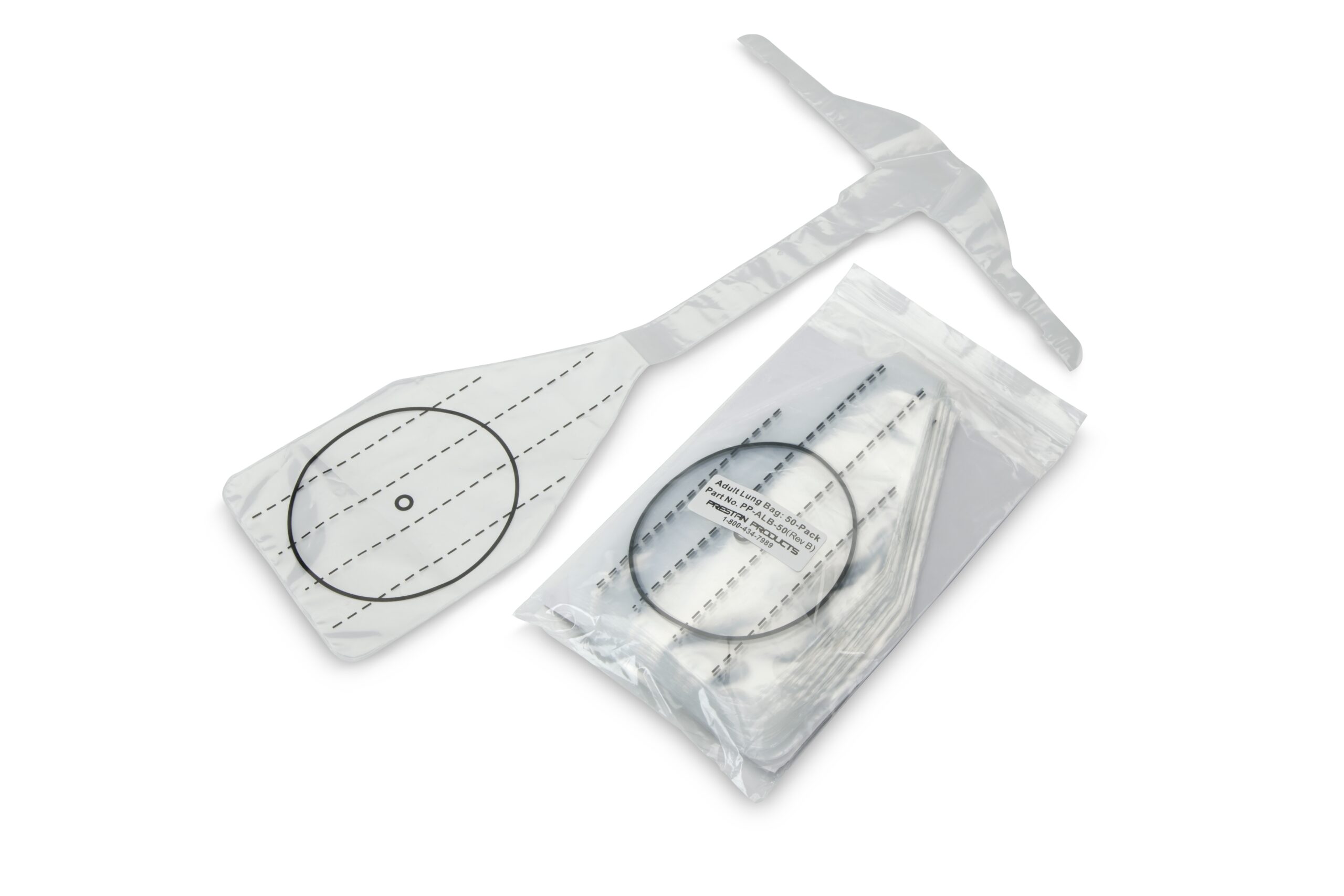 - El protector facial / pulmón combina la protección facial y el pulmón en una vía aérea individual en forma de T para el maniquí. El aire ingresa por el protector abriendo la bolsa pulmón, lo que provoca que el pecho del maniquí se infle visiblemente en respuesta a las insuflaciones de RCP administradas.